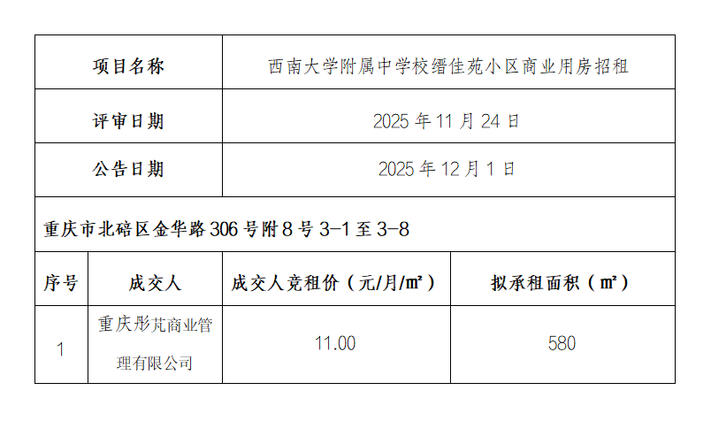 西南大学附属中学校缙佳苑小区商业用房招租结果公告
