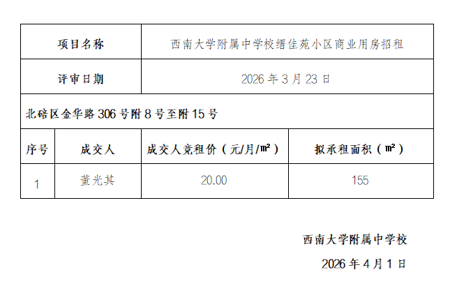 西南大学附属中学校缙佳苑小区商业用房招租结果公告