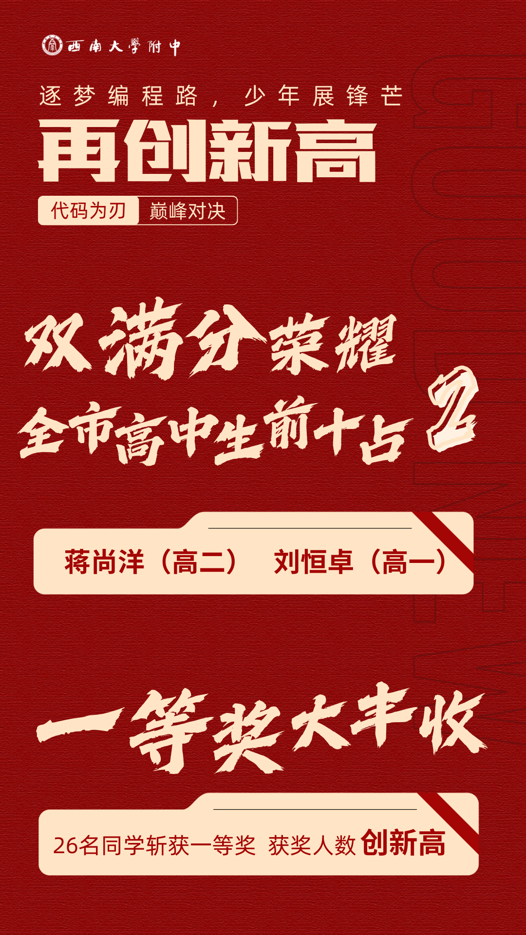 荣耀加冕,不负耕耘。在此,向所有获奖同学致以最热烈的祝贺!每一份成绩的背后,是同学们日夜钻研的坚守、反复打磨的执着;离不开信息学竞赛指导团队的悉心授课、精准赋能;更得益于学校对信息学竞赛与科技创新教育的高度重视——特色课程筑基、系统训练提能、浓厚氛围赋能,为学有余力、热爱科创的学子搭建起成长成才的广阔平台。