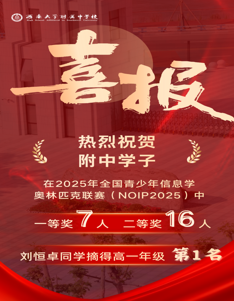 键盘敲击的是代码的韵律,屏幕闪烁的是思维的光芒。近日,2025 年全国青少年信息学奥林匹克联赛(NOIP2025)成绩揭晓,西南大学附中的少年们不负众望,在这场全国性的硬核较量中,交出了一份亮眼答卷!斩获一等奖 7 人、二等奖 16 人的亮眼佳绩,在算法与逻辑的赛场绽放附中风采。
