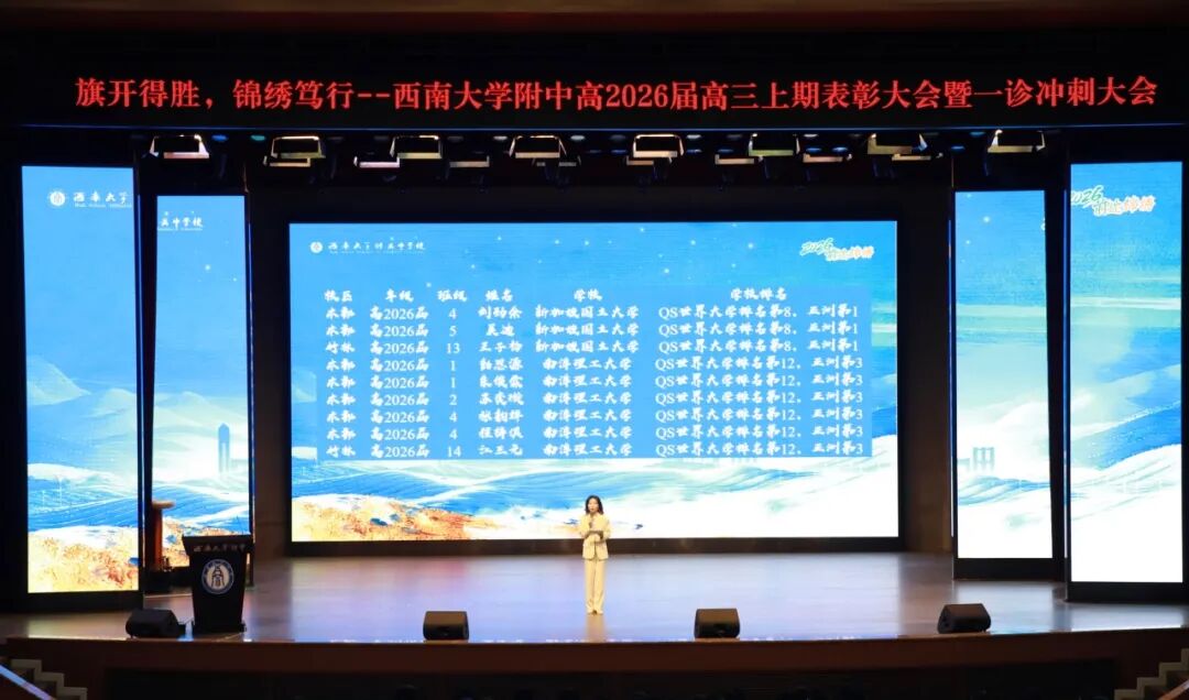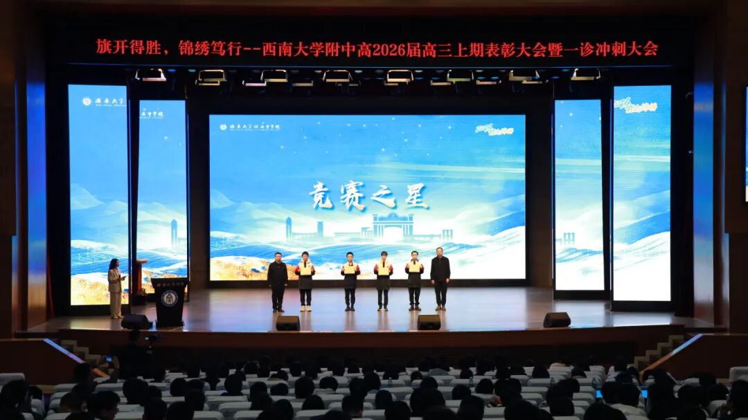 初冬的校园里,奋进的号角划破长空,拼搏的身影汇聚成青春的激流。在这个距离高考185天、一诊考试仅剩56天的关键节点,西南大学附属中学高2026届全体师生齐聚一堂,隆重举行“旗开得胜,锦绣笃行”高三上期表彰大会暨一诊冲刺大会。