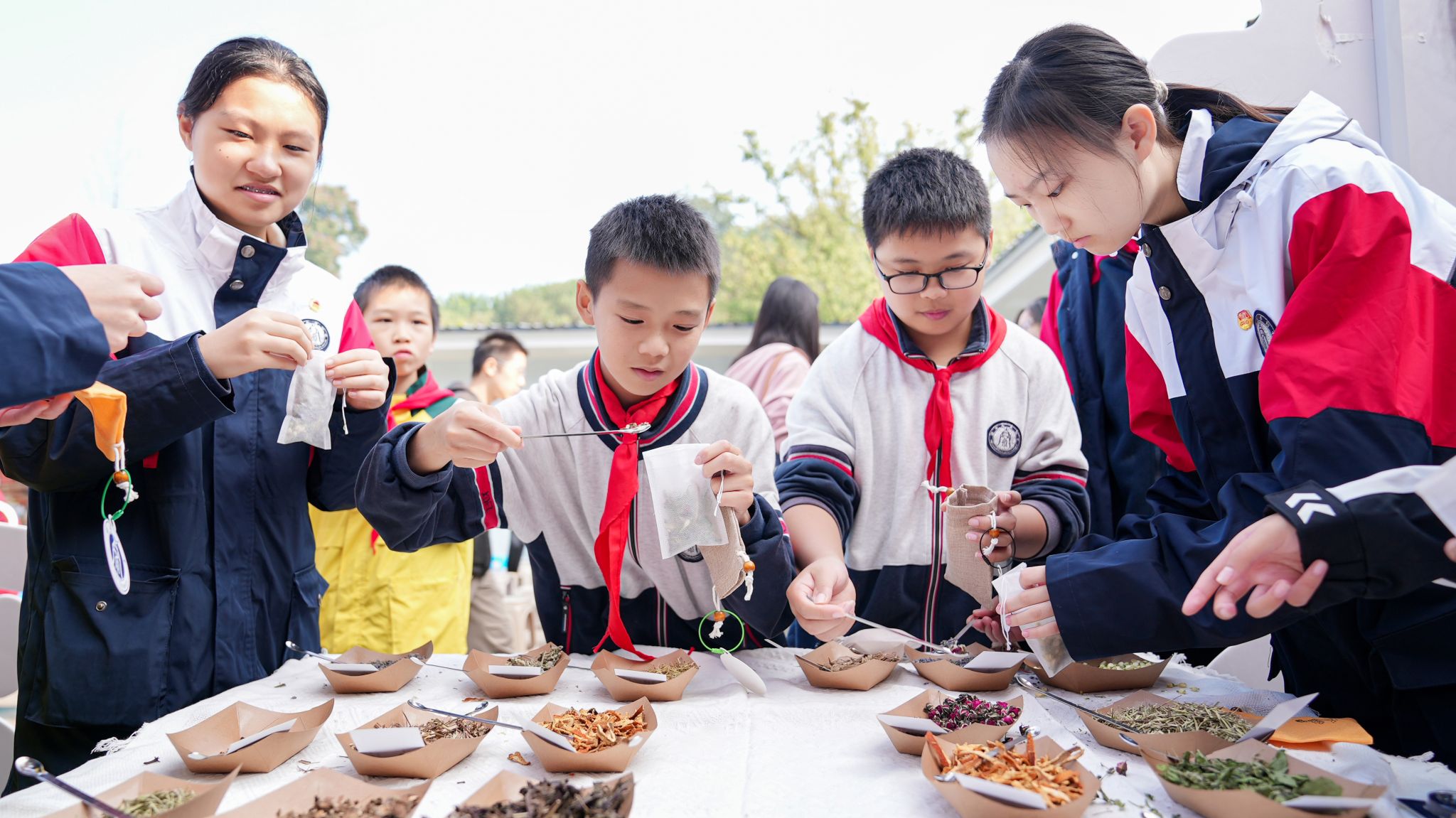 活动现场还设置了“重阳香囊手工坊”、“植物拓印手工坊”及插花课堂,成为文化传承的生动载体。在香囊工坊,学生们按古法配方填充艾草、薄荷等药材;植物拓印区,大家采集银杏叶、桂花枝等秋日素材,将自然纹理拓印于帆布包;插花课堂上,大学志愿者指导附中弟弟妹妹修剪花枝、搭配色彩;在劳动成果品尝区,大家兴奋地品尝着劳动带来的香甜,体会食物背后的文化内涵。