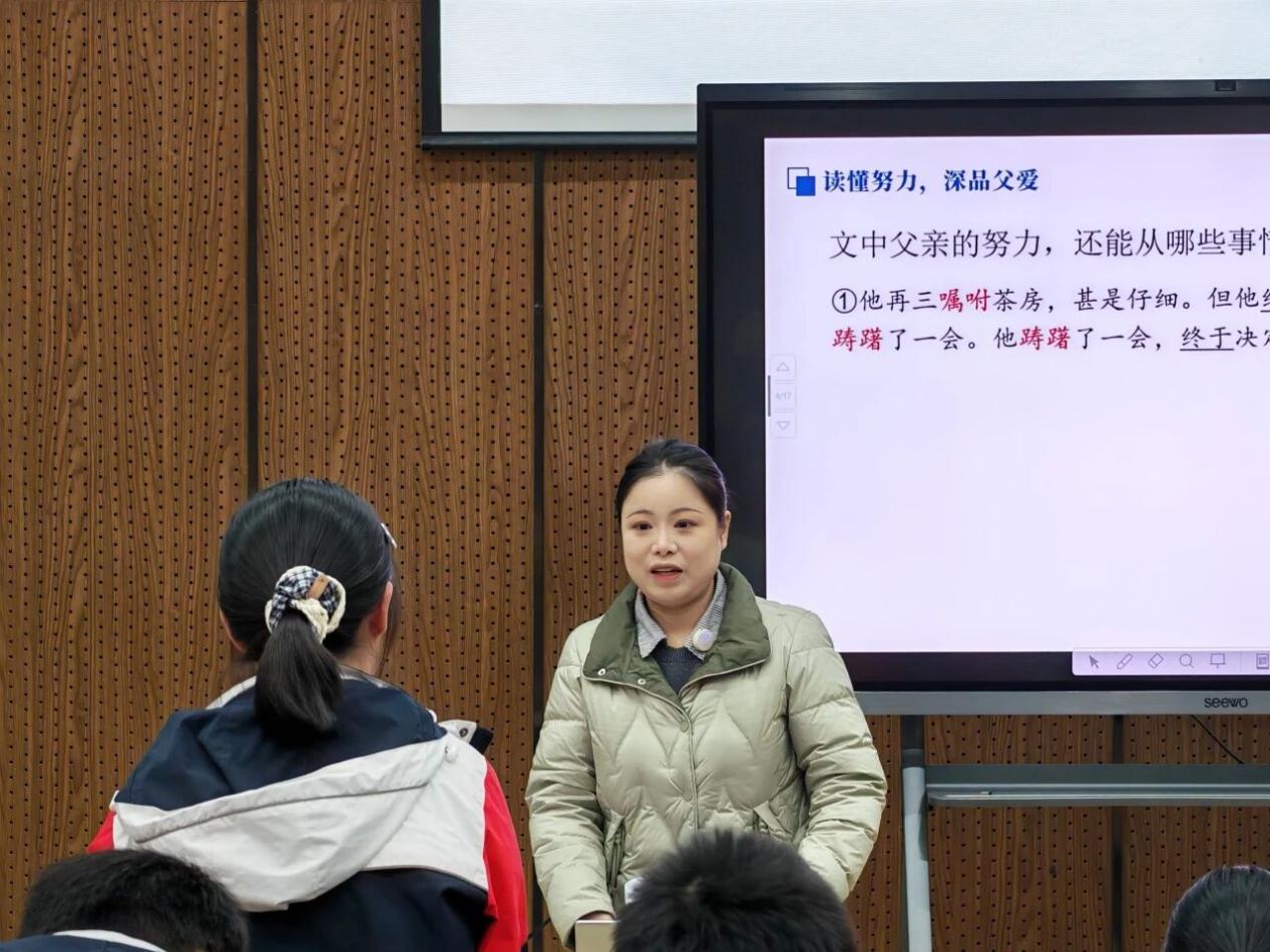 王梅老师的课程同样以文本细读为根基,围绕“以背影为锚点,悟藏于细节的父爱”这一核心主题展开。她首先引导学生聚焦车站送别段落,通过圈点批注父亲的动作、外貌等细节描写,让学生在文字肌理中感知父爱朴素、厚重又温暖的特质,读懂经典“背影”承载的深层温情;接着,她巧妙搭建文本与生活的联结,结合学生自身的成长体验,由文中父亲的付出延伸至生活中父母的点滴关怀,深化学生的情感共鸣;最后,她引导学生理解亲子间“情感的错位与平衡”,让大家明白“爱并非完美无瑕,唯有多一份理解与包容,才能读懂父母付出的深意”。