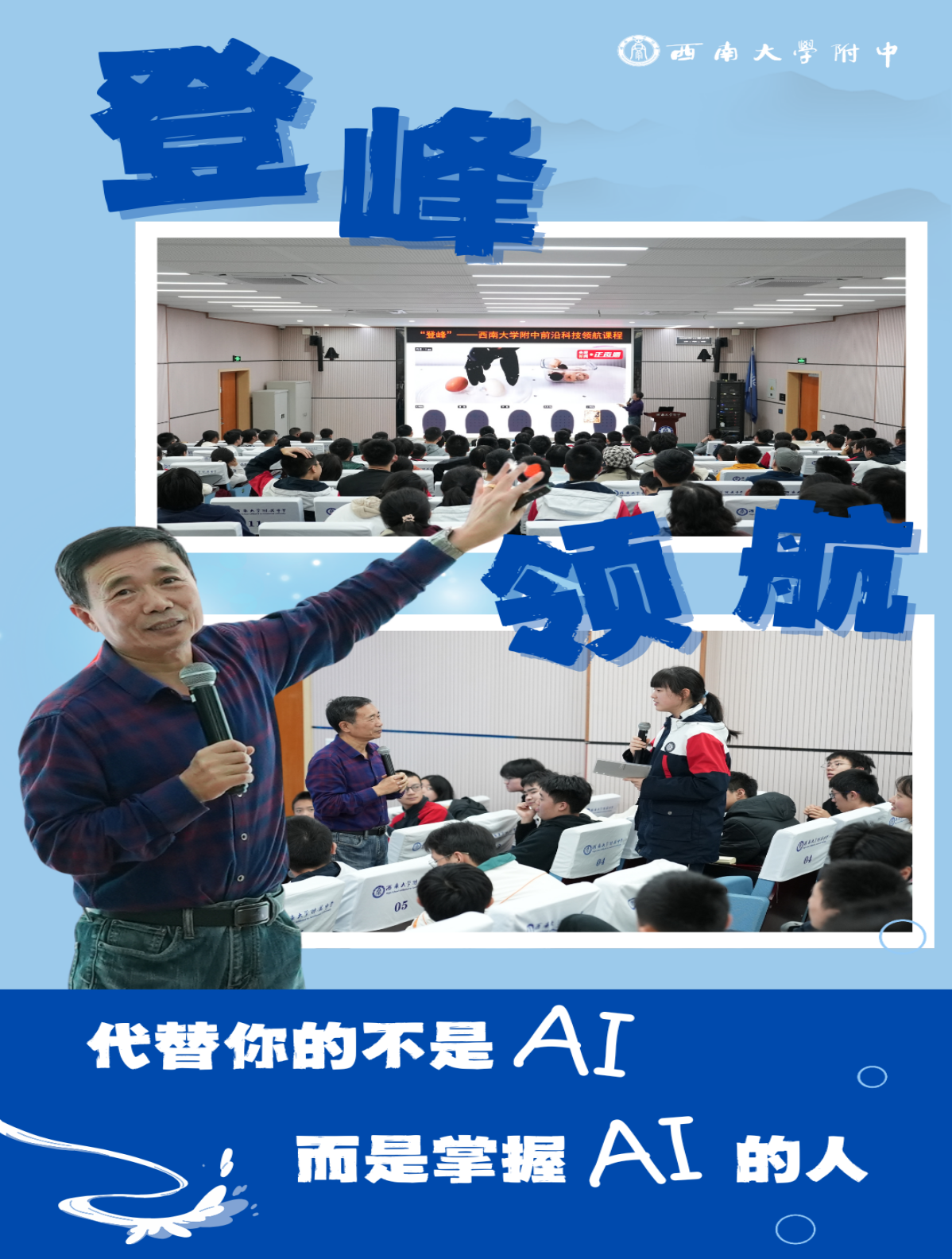 “代替你的不是AI,而是掌握AI的人”。近日,清华大学计算机系马少平教授应邀走进西南大学附中“登峰”前言科技领航课程,与我校学子展开一场兼具深度与温度的人工智能对话。我校游伟副校长、信息学竞赛教练团队及全体信息学竞赛学子、广延班学生代表共同参与了本次课程。