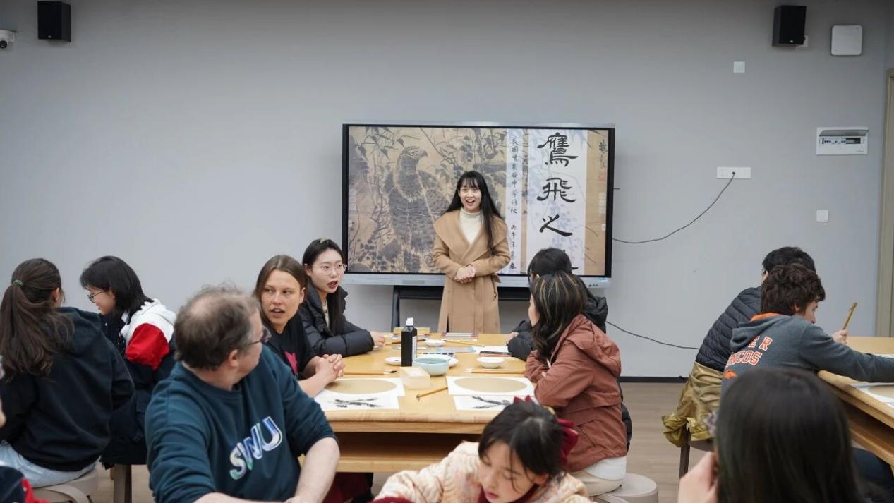 呼应“鹰飞之城”的活动主题,大家以绢为纸、以墨为媒,在西附国际学子们的协助下,美国师生将重庆本土的灵动鹰类绘于绢纸上。从勾勒轮廓到晕染色彩,美国学生们在笔尖流转中,体会中国传统工笔与写意的艺术魅力;让小小绢面成为传递中国自然之美、艺术之韵的载体,也让 “鹰飞之城” 的主题在笔墨间生动呈现。