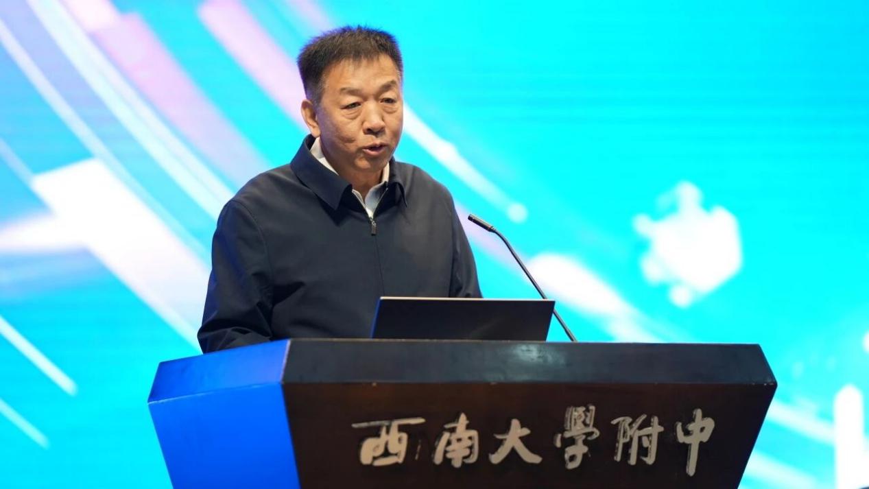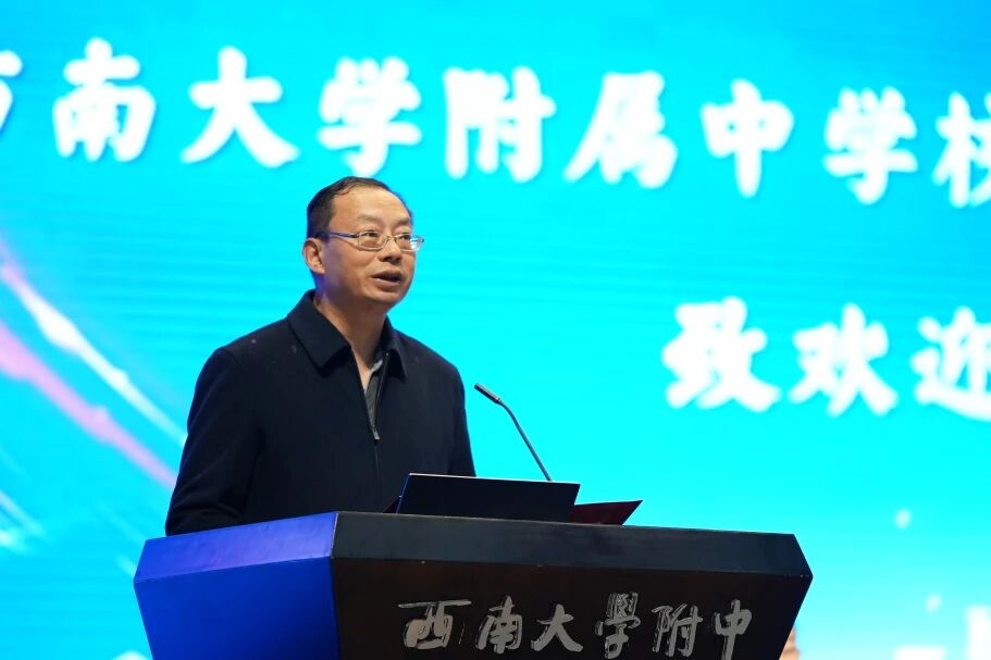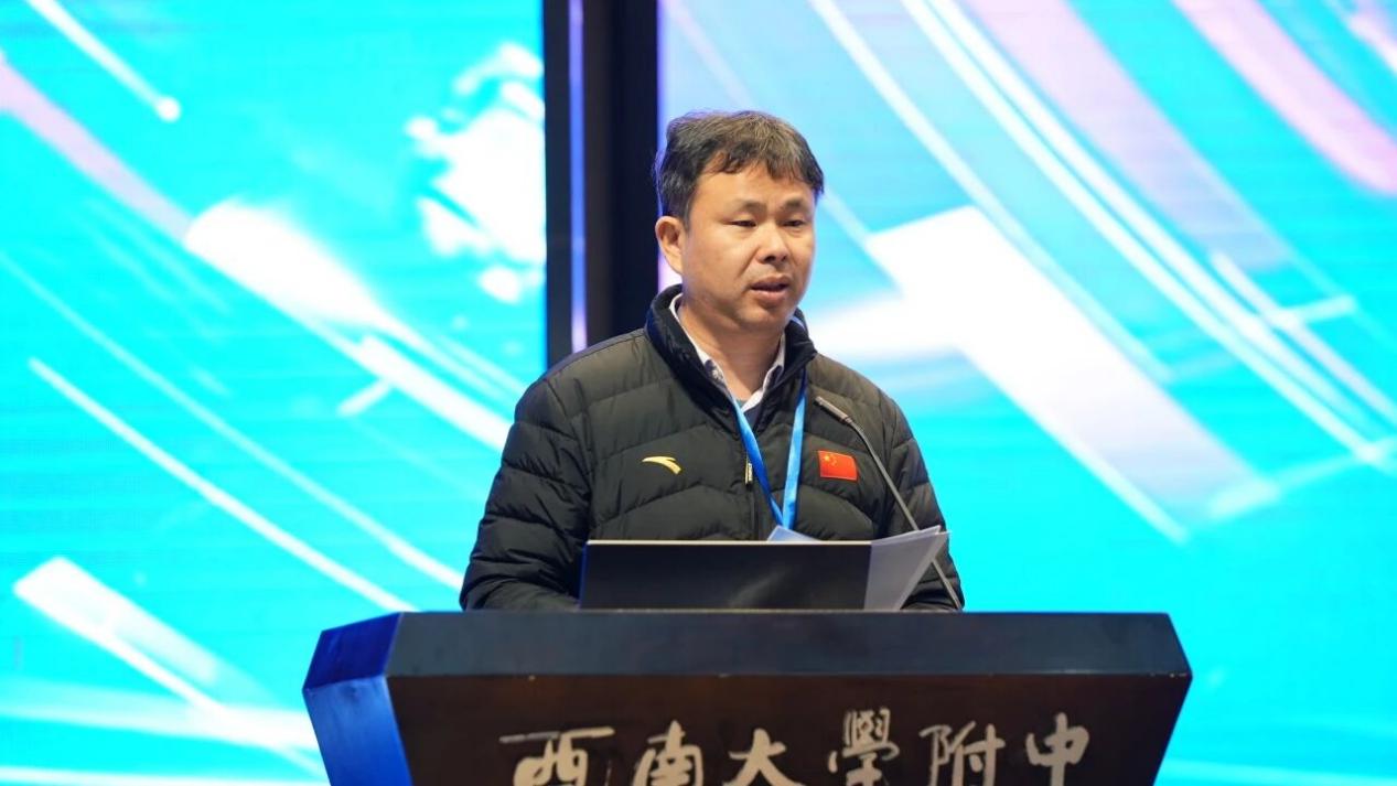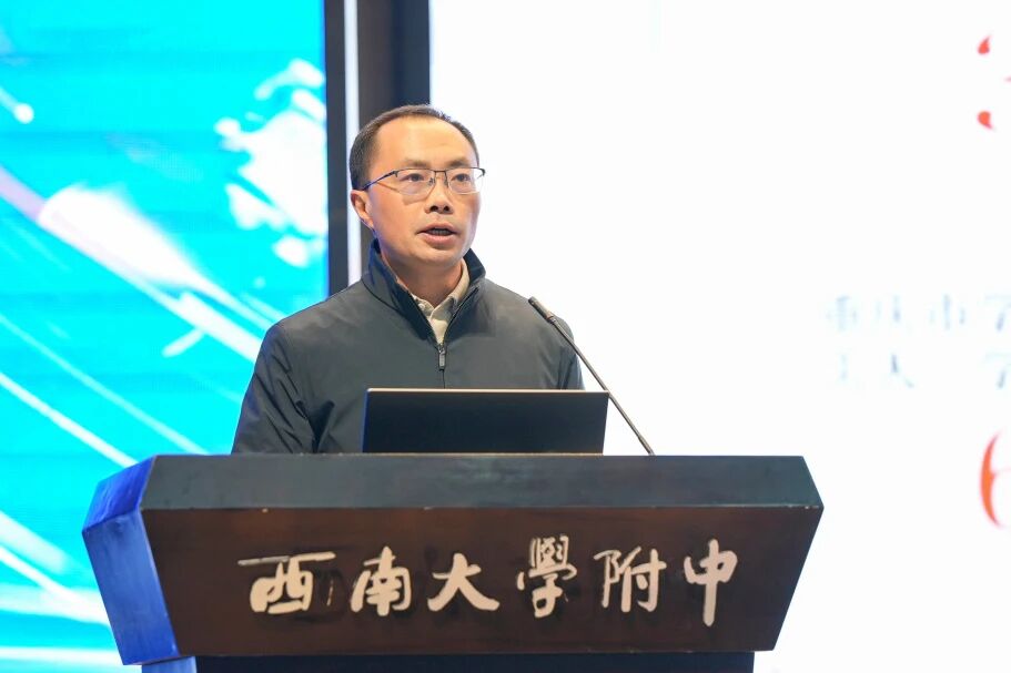 西南大学附属中学校党委书记欧健致欢迎辞。他代表学校对与会嘉宾的到来表示热烈欢迎,并分享了西南大学附中在后勤管理领域的探索与实践。他表示,本次研讨会由西南大学附中承办,既是中国教育后勤协会等对学校后勤管理工作的高度信任,更是学校向全国先进同仁学习、交流经验、提升办学品质的宝贵契机,希望大家能一起探索人工智能与大数据赋能学校后勤的有效路径,共同书写新时代中小学后勤高质量服务与高水平育人的崭新篇章。