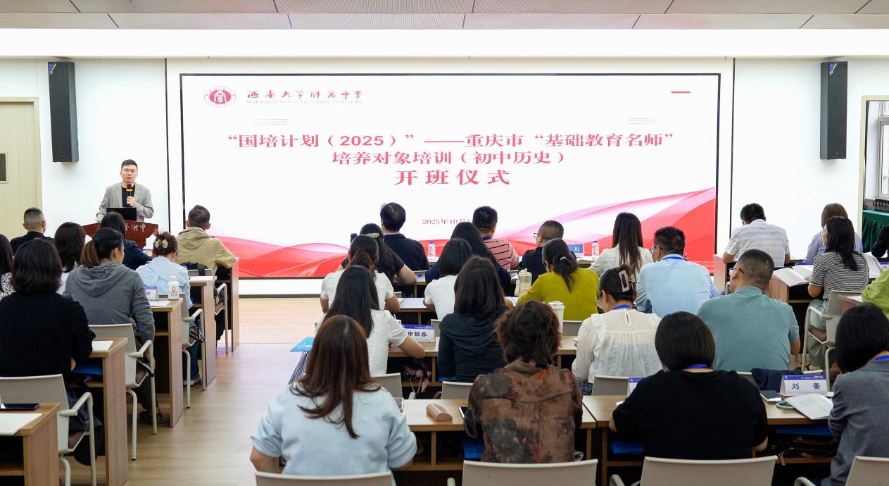 10月14日,“国培计划(2025)”——重庆市“基础教育名师”培养对象培训(初中历史)开班仪式在西南大学附中圆满举行。来自全市的50位历史学科名师相聚于此,开启新的学习旅程。西南大学附中校长、党委副书记张勇,重庆市教育学会中学历史教学专委会理事长、西南大学附中总督学邓晓鹏等领导出席仪式。仪式由西南大学附中副校长徐川主持。
