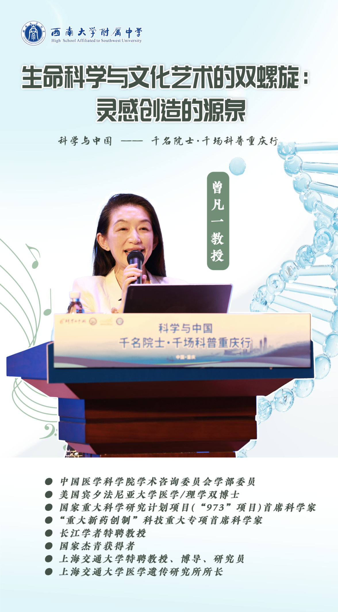 2025年10月10日上午,“科学与中国——千名院士·千场科普”重庆行活动走进西南大学附属中学(东区)。国家重大科学研究计划首席科学家、上海交通大学特聘教授、医学遗传研究所所长曾凡一教授莅临学校,在新民学术报告厅为千余名师生带来了一场题为《生命科学与文化艺术的双螺旋:灵感创造的源泉》的科普讲座。