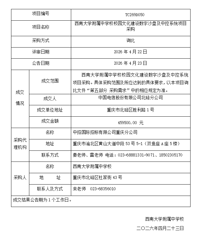 西南大学附属中学校校园文化建设数字沙盘及中控系统项目采购成交结果公告