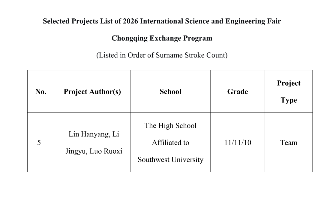 经过重庆地区众多优秀项目的激烈角逐,我校3名学子林翰阳、李婧语、罗若溪成功脱颖而出,以优异的综合科研素养正式入围2026 ISEF全球总决赛!