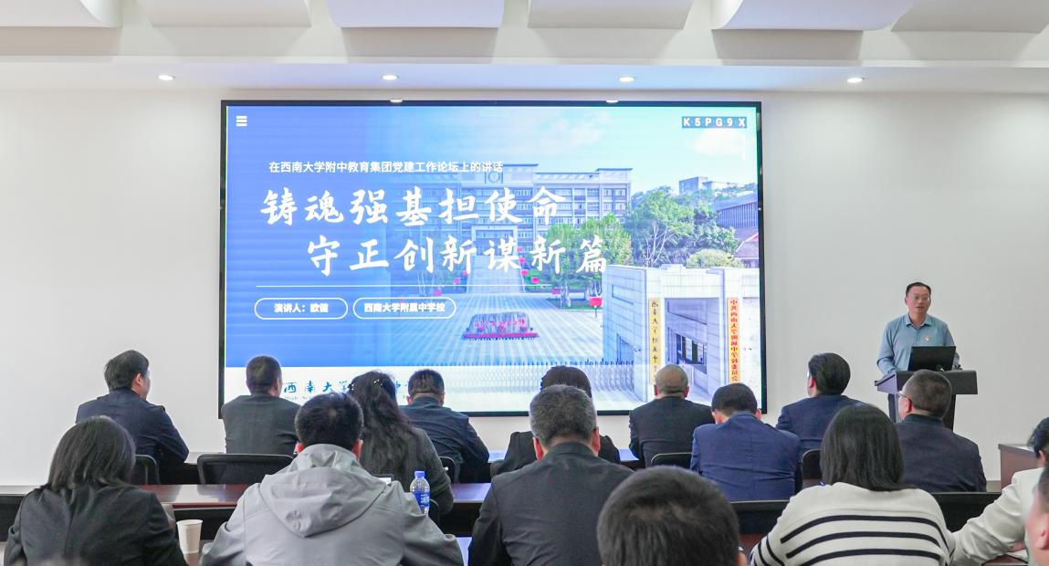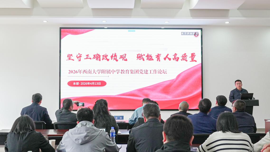 2026年4月13日,西南大学附属中学教育集团党建工作论坛在本部举行。论坛以“坚守正确政绩观,赋能育人高质量”为主题,聚焦以高质量党建引领学校“十五五”高质量发展,集团各校区党组织负责人、执行校长、党务工作者及教共体学校代表等参加。