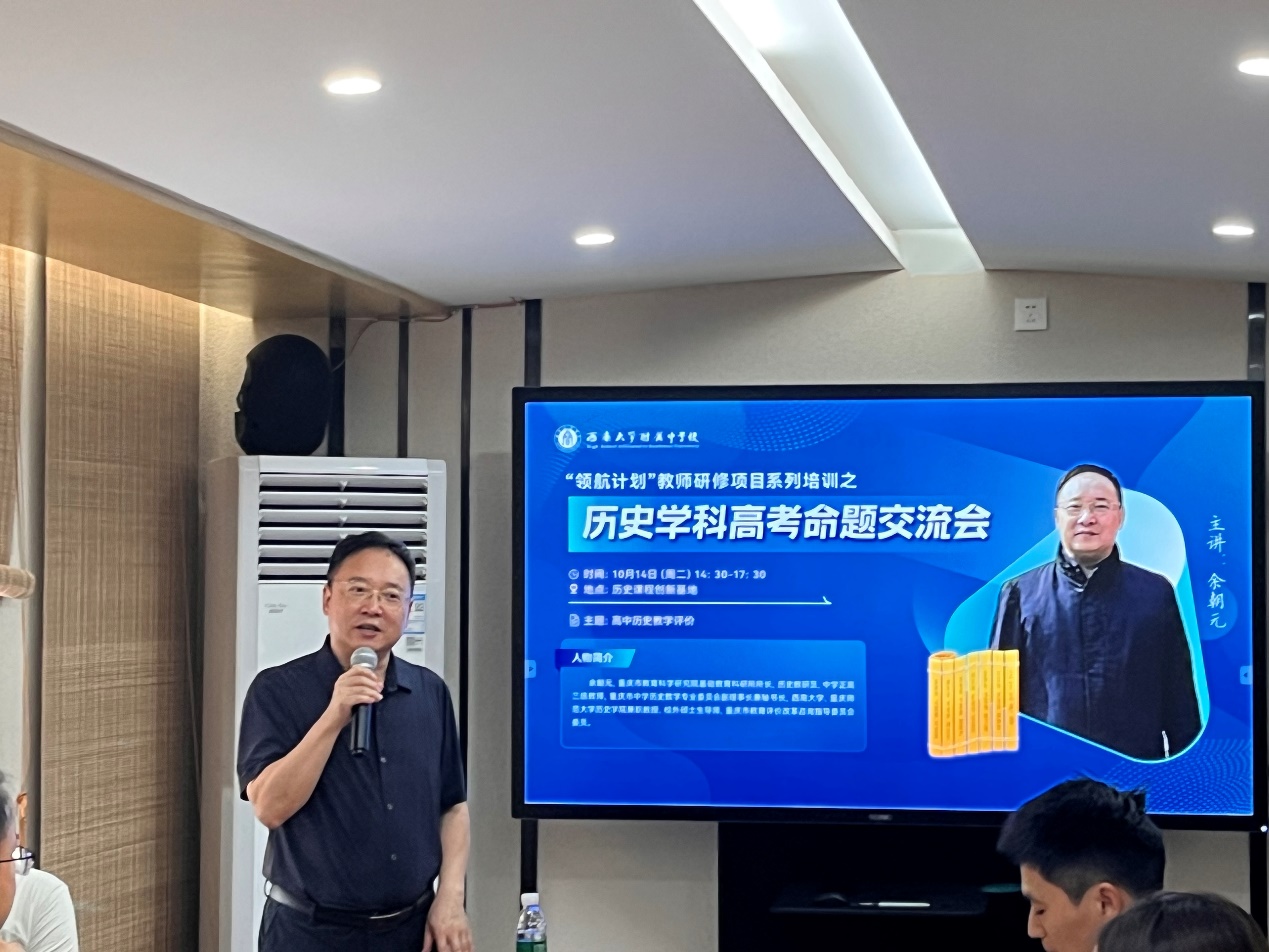 为深化高中历史学科高考命题研究,探索新高考背景下高中历史命题实践路径,提升教师命题专业能力与教学质量,10月14日,西南大学附中“领航计划”教师研修项目之历史学科高考命题交流会在校本部历史课程创新基地举行。本次交流会以“高中历史教学评价”为主题,特邀重庆市教育科学研究院基础教育科研所所长、历史教研员、中学正高级教师余朝元老师主讲,西南大学附中历史教研室“领航计划”研修学员、各校区历史教师代表参与本次活动。