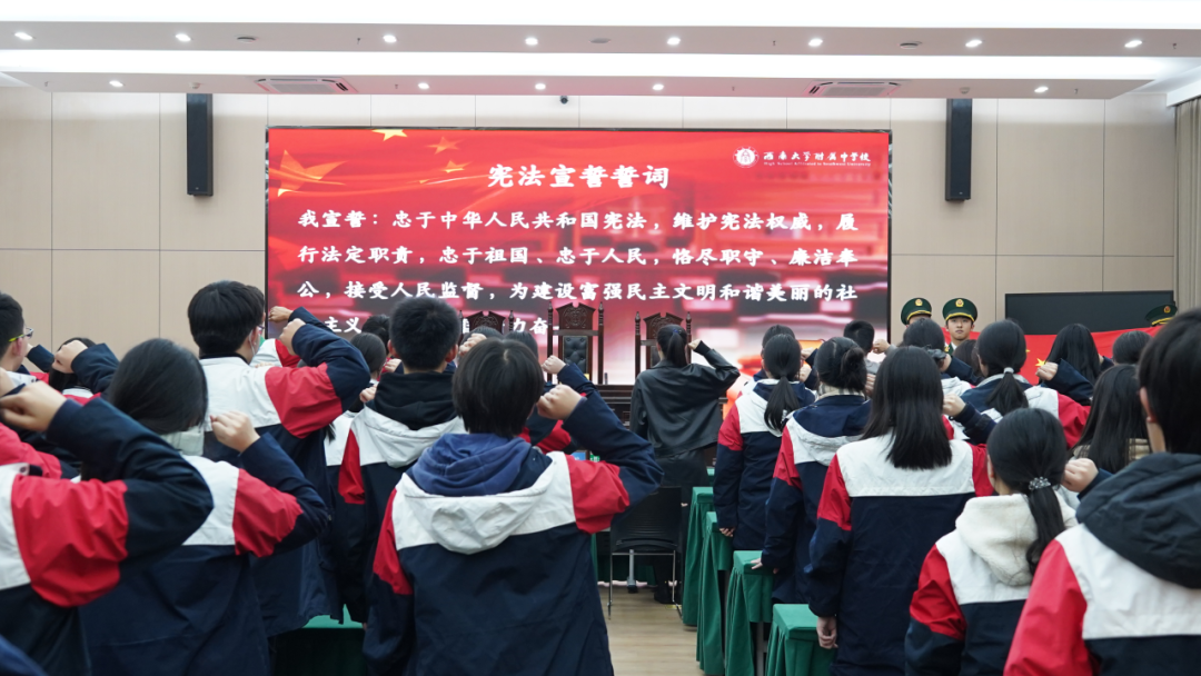 活动的最后,在庄严的国旗与《中华人民共和国宪法》前,全体学员肃立,由学员代表领誓,共同许下尊崇宪法、维护宪法的郑重誓言。誓词铿锵,回荡全场,彰显着附中学子争做社会主义法治忠实崇尚者、自觉遵守者、坚定捍卫者的决心。