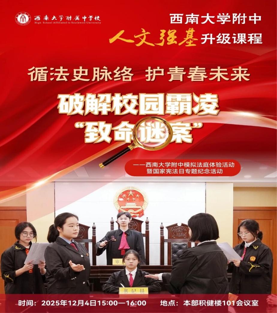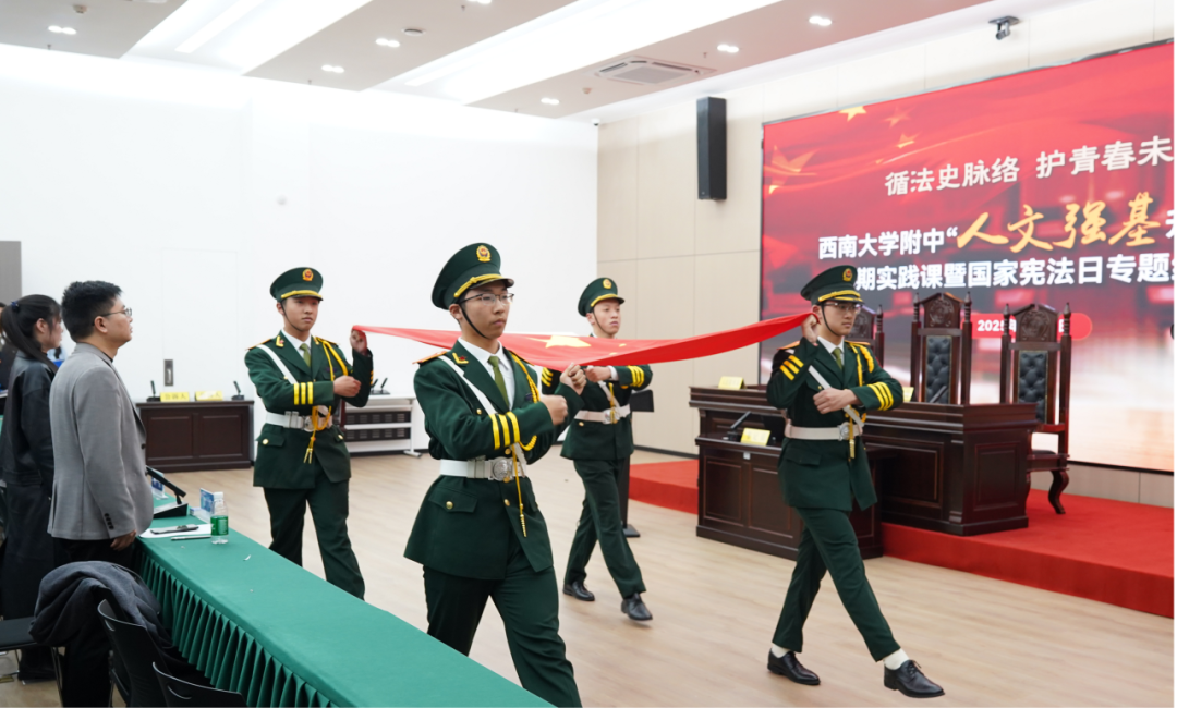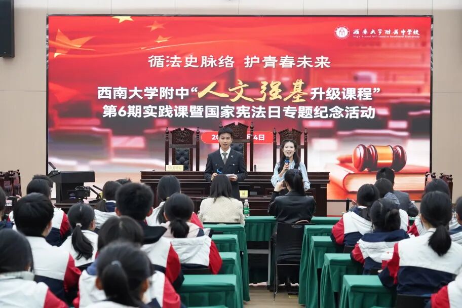12月4日,西南大学附中本部积健楼101内,庄严肃穆的氛围中,一声法槌敲响——“人文强基升级课程”第六期实践课暨国家宪法日专题纪念活动正式拉开帷幕。