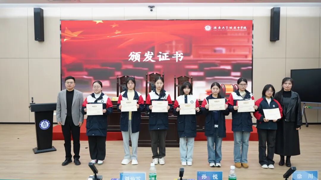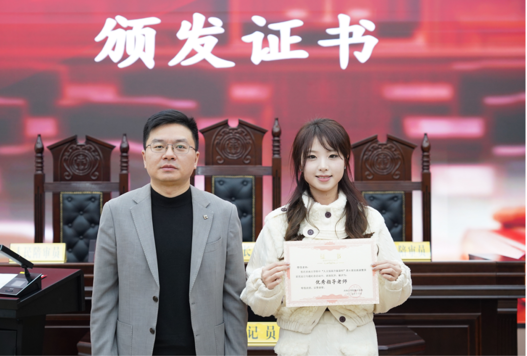 为感谢指导教师的辛勤付出,徐川副校长向西南大学廌鸣法律社负责人李佳老师颁发了“优秀指导教师”证书,致敬其全程陪伴与专业引领。