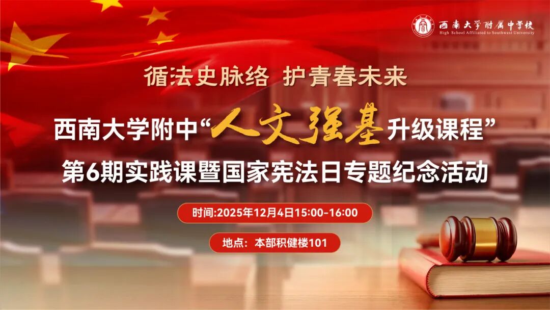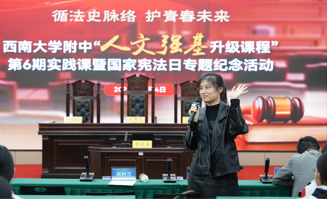12月4日,第十二个国家宪法日,一场以“循法史脉络,护青春未来”为主题的实践课,为历时两个月的西南大学附中第六期“人文强基”升级课程画上了震撼而深沉的句号。从法学源流的理论溯源,到法庭实战的躬行践履,附中学子完成了一次对法治精神的深度叩问与传承