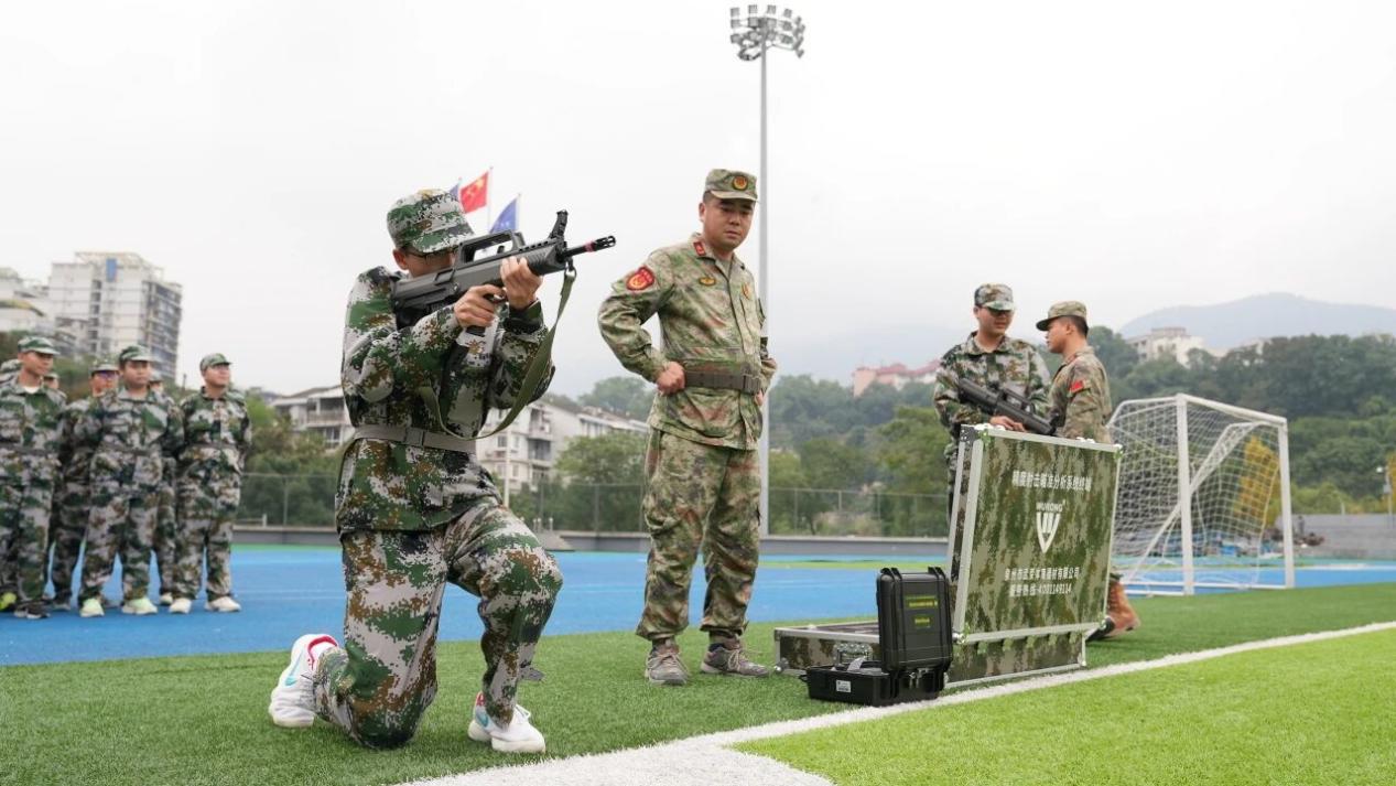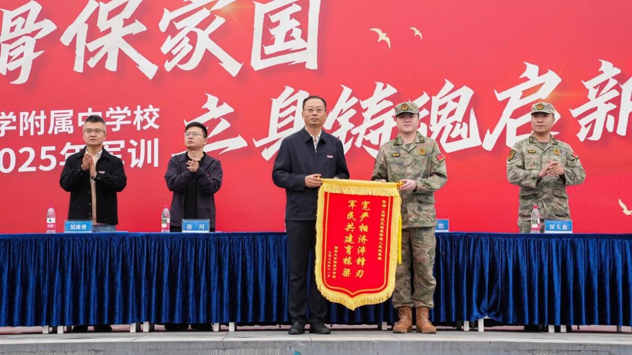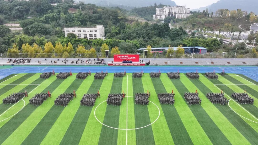 仪式最后,北碚区人民武装部大校政治委员黄立军庄严宣布:“西南大学附属中学校高2028届军训,现在开训!”激昂的《红旗颂》旋律应声响起,开训仪式在热烈庄重的氛围中圆满礼成。