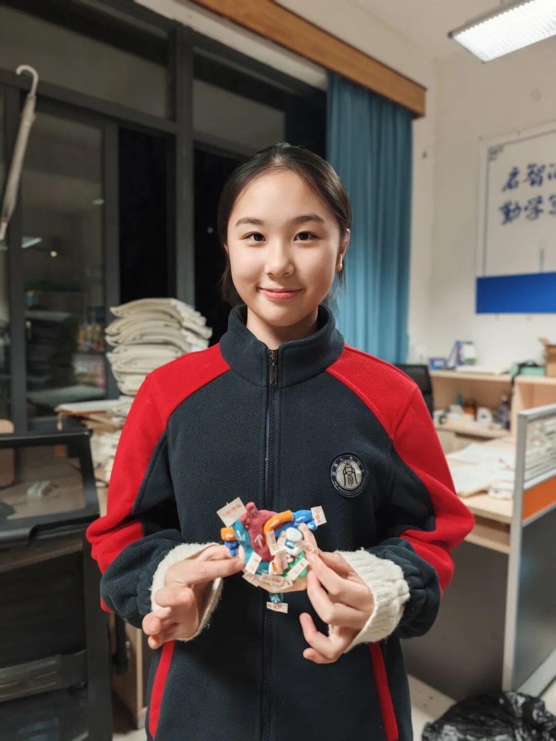 我制作了一个心脏模型,在亲手在制作过程中我反复对比心脏相连每个血管的位置,调整结构,我不仅摸清楚了器官的构造,也真切读懂了生命器官的精巧。这次的获奖是意外之喜,而亲手揭开生命奥秘的过程,才是最珍贵的收获。