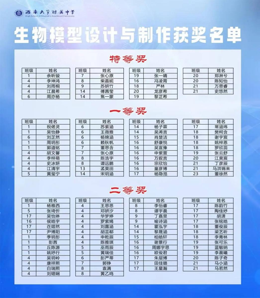 本次共评选出100余件优秀作品,包括特等奖19名、一等奖40名,二等奖54名,利用电子班牌、活动展区等多点进行公示。评选结果如下。