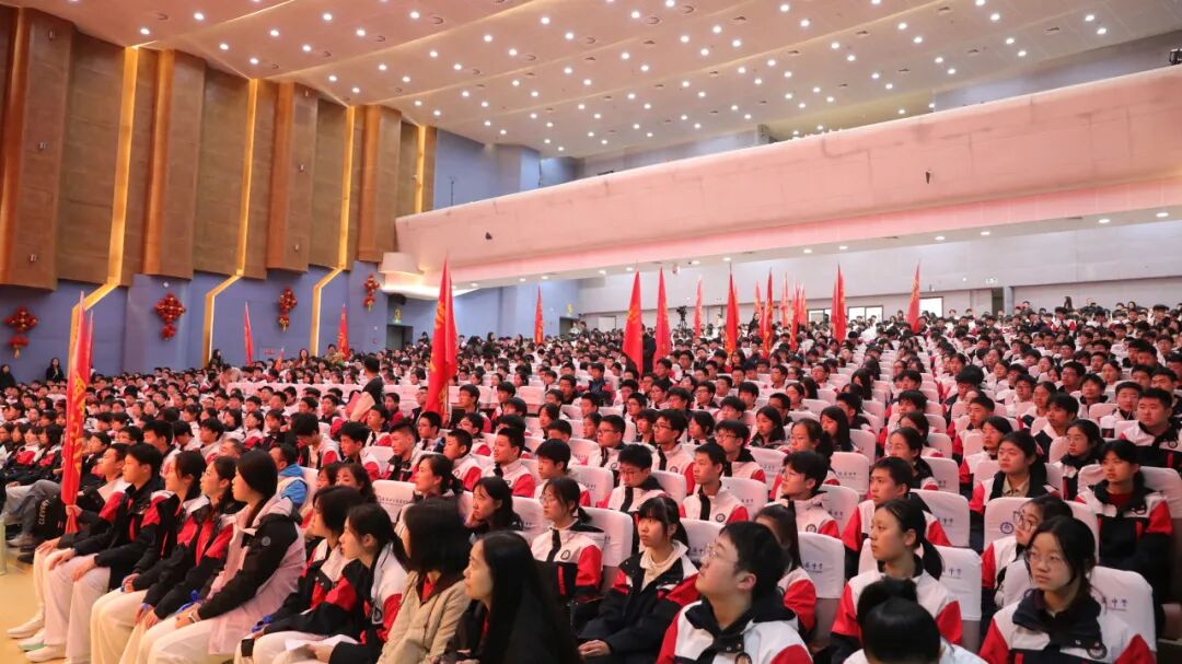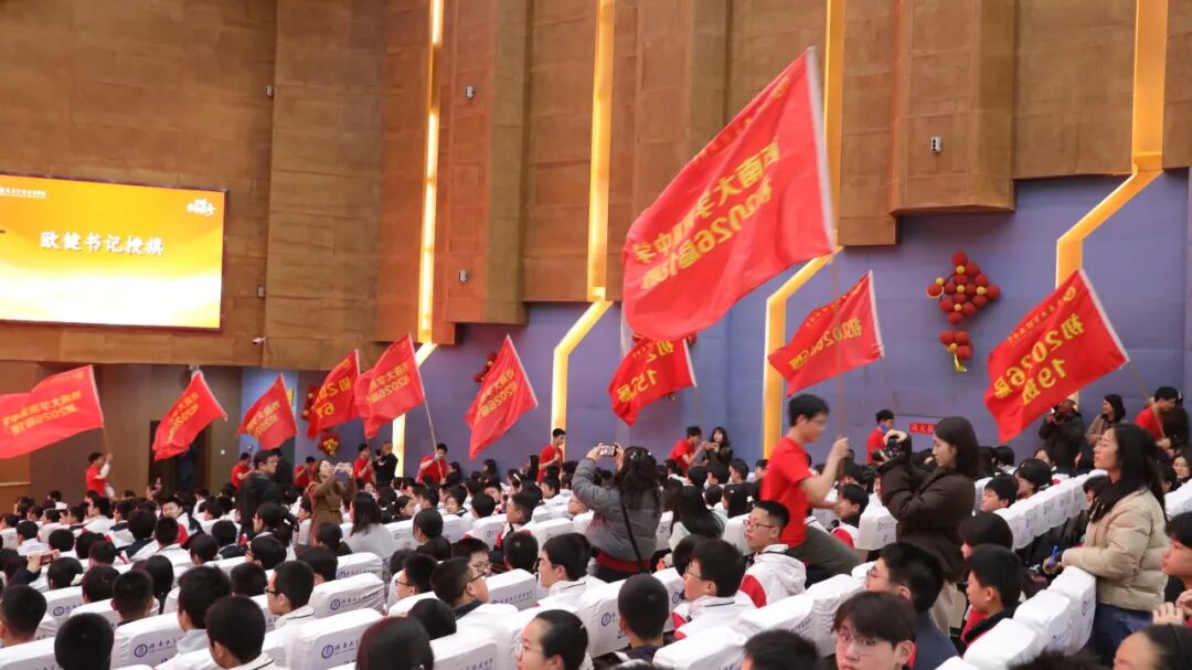 校党委书记欧健为初2026届授旗,年级主任李海涛与学生代表共同接旗,猎猎战旗在报告厅内挥舞飞扬,各班旗手紧随其后绕场奔跑,象征着青春的力量汇聚成河,奔涌向前。