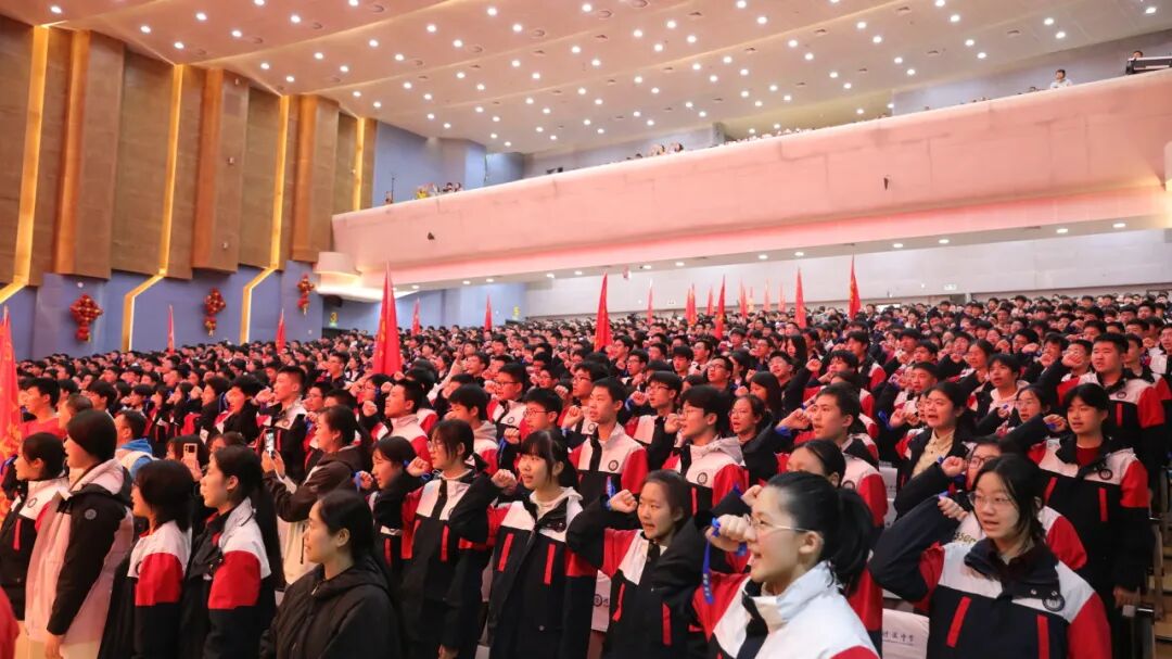 全体学生在领誓人闫绪峒同学的带领下,举起右拳庄严宣誓:“百日为期,青春绽放;感恩父母,感谢师长;沉着冷静,脚踏实地;携手共进,永不言弃;笔下生花,圆梦今夏;二零二六,凯歌高奏。”誓言如雷,响彻全场,映照出少年心中最滚烫的梦想。