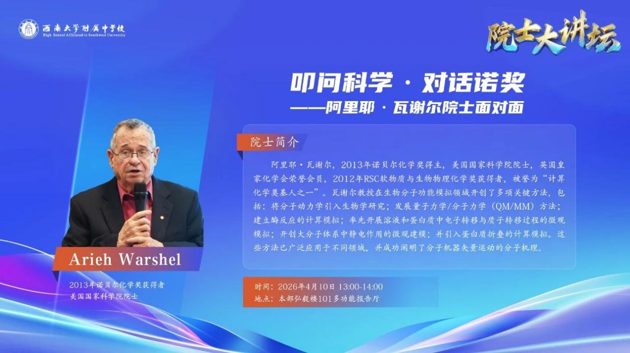 缙云含黛,嘉陵韵长。4月10日,2013年诺贝尔化学奖得主、美国国家科学院院士、计算化学奠基人之一——阿里耶·瓦谢尔教授莅临西南大学附中,以一场跨越国界的科学对话,为附中学子点亮探索之路。