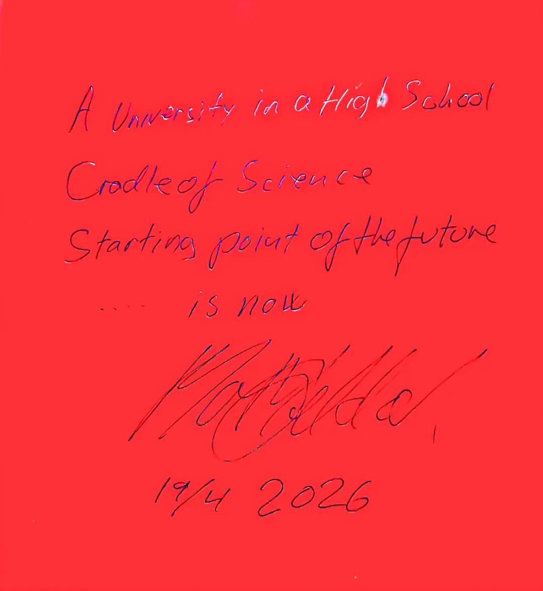 随后,两位院士分别为学校留下题词。埃菲·杰曼诺夫院士寄语西南大学附中在数学及所有科学领域持续深耕、再创佳绩;莫滕·彼得·梅尔达尔院士则高度赞誉我校“中学里的大学”的办学特色,称这里是孕育科学萌芽的摇篮,更是学子奔赴未来的起点,鼓励同学们立足当下、即刻启航。