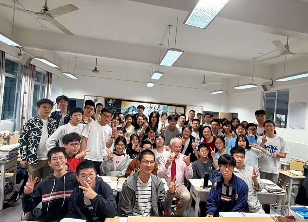 莫滕·彼得·梅尔达尔院士欣然走进高二9班教室,并拿出诺奖奖牌,和全班同学合影留念,定格下珍贵的一幕。