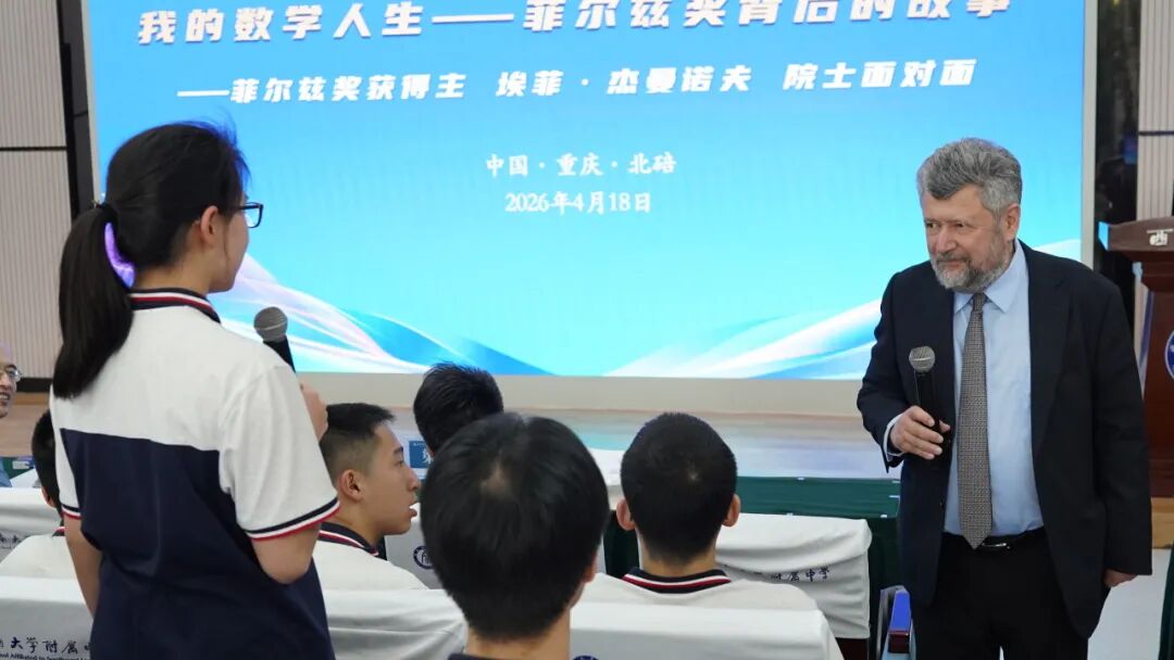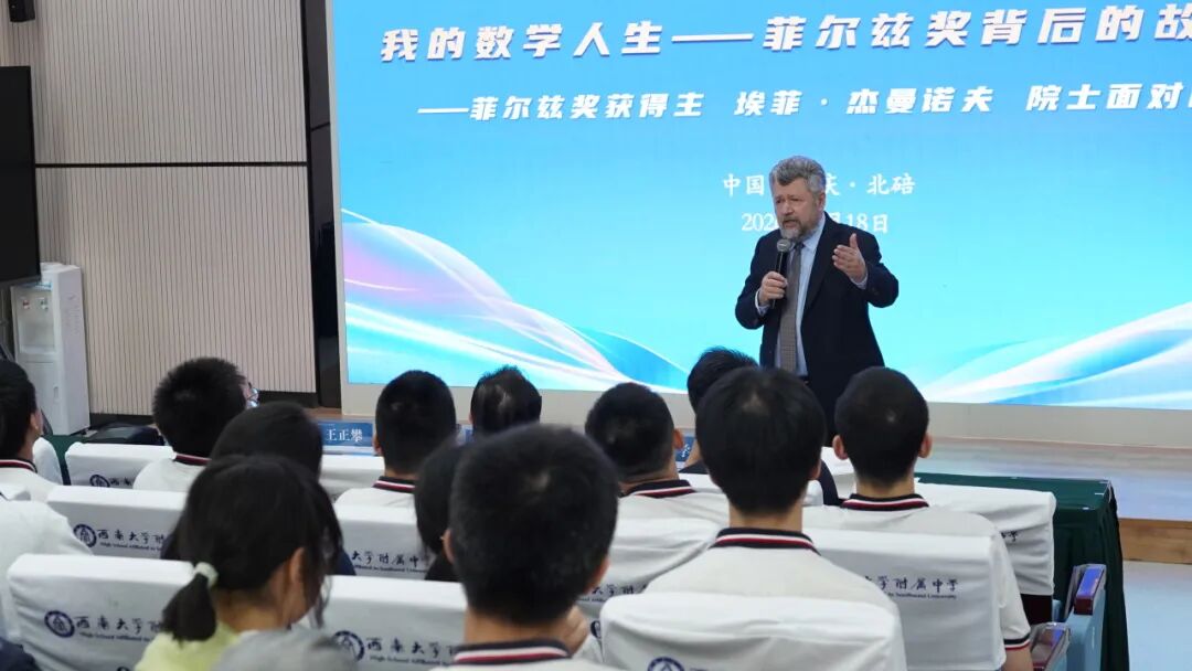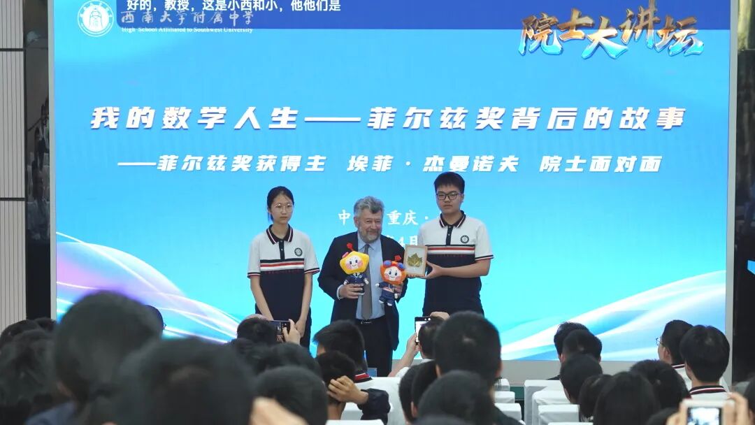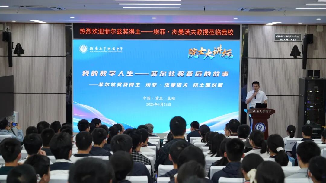 4月18日至19日,西南大学附属中学校园内智慧涌动,科学之光格外璀璨。两天之内,1994年菲尔兹奖得主埃菲·杰曼诺夫院士与2022年诺贝尔化学奖得主莫滕·彼得·梅尔达尔院士先后莅临西南大学附中高阶学问品牌课程“院士大讲坛”,一场关于数学本质与化学创造的学术盛宴,在这所“中学里的大学”接连上演。从抽象代数到点击化学,从人工智能到药物开发,两位科学巨匠以深邃的洞见与温暖的人格,在附中学子心中播下了探索与坚持的种子。