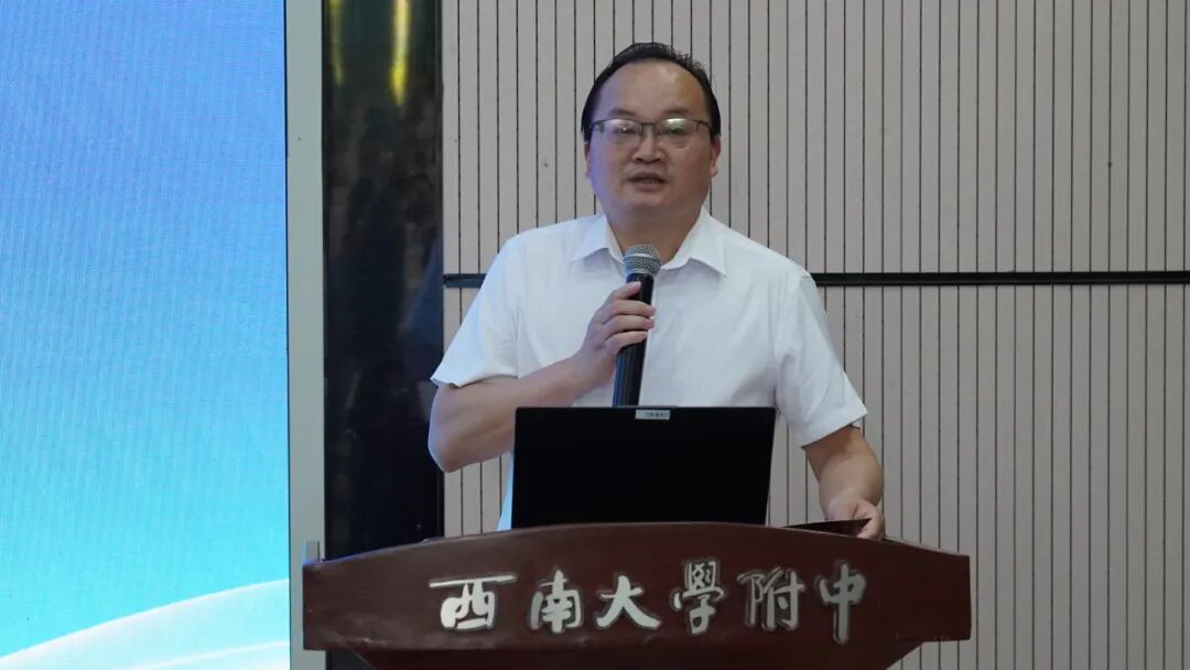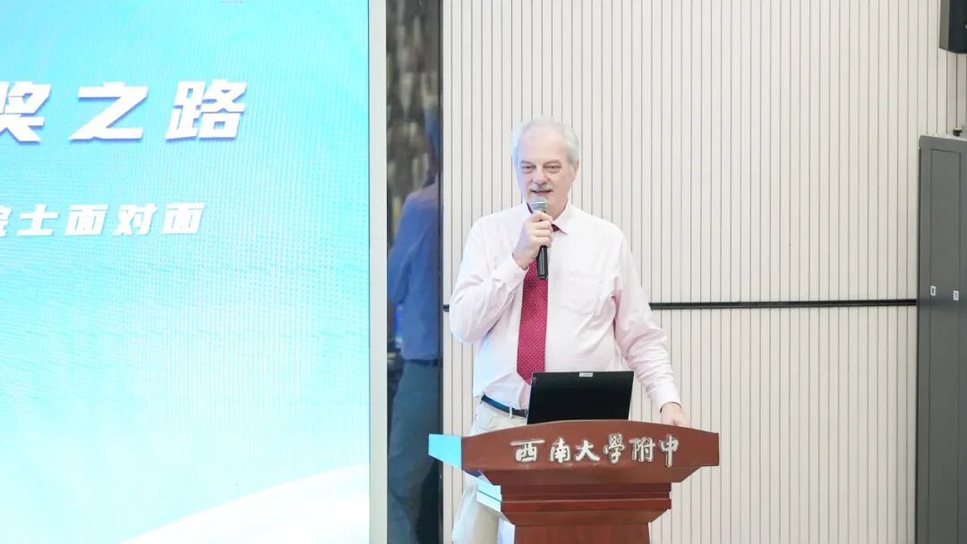 西南大学附中梁学友副校长代表学校致欢迎辞。他强调菲尔兹奖素有“数学界诺贝尔奖”之称,是全球数学领域的最高学术荣誉。埃菲·杰曼诺夫院士解决了整个20世纪群论中最根本、最困难的问题,在代数领域作出了奠基性贡献。埃菲·杰曼诺夫院士的数学人生,本身就是一部探索与热爱的传奇。
