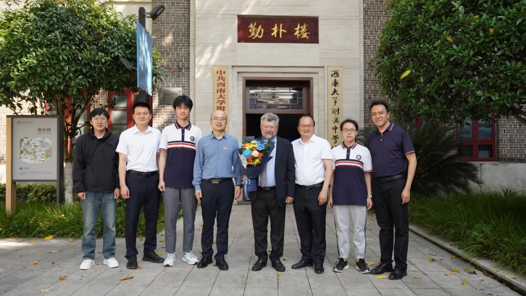 4月19日傍晚,莫滕·彼得·梅尔达尔院士一行抵达西南大学附中本部新校门,学生代表手捧鲜花热烈欢迎院士一行的到来。西南大学附中校长、党委副书记张勇,副校长游伟,以及西南大学材料学院院长王中长等领导和师生代表陪同接待。院士一行在勤朴楼前合影留念,随后漫步校园,切身感受附中 “立人·新民” 的办学底蕴。