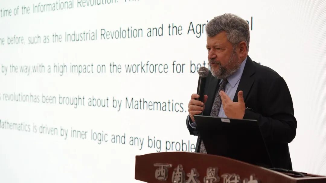 在经久不息的掌声中,埃菲·杰曼诺夫院士走上讲台。他以《Mathematics in the modern world》为题,以时间为脉络,回顾了两千年来数学与人类文明、科技进步的紧密关联——从几何学到复分析,从偏微分方程到流体力学,数学始终是推动技术革命的根本动力。他强调“证明是数学的灵魂”,这份严谨性让数学兼具科学的精准与艺术的美感。结合信息革命时代背景,他明确提出“没有数学就没有AI”,向量、矩阵、梯度下降等关键知识正是深度学习的坚实基础。