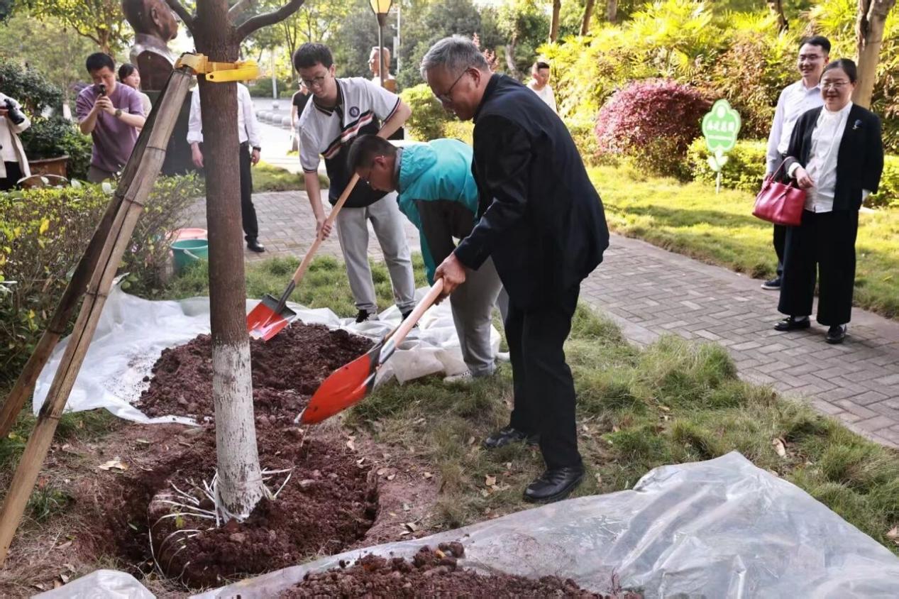 课程尾声,张院士来到校园中的“院士林”,与师生代表一同挥锹培土、提水浇灌,亲手种下一棵象征希望与传承的树苗。和煦的春风中,新苗昂然挺立,仿佛一位位渴求真理的少年,扎根知识的沃土,向着科学的蓝天奋力生长。学校党委书记黄均平向张院士赠送了一方取材于合川本土的石雕砚台,凝聚着学子对院士最朴素、最诚挚的敬意;张院士则回赠亲笔书法作品,八个大字饱含着对青年学子和陶行知教育文脉沃土的殷切期望。这一刻,科学精神与传统文脉完美交融。