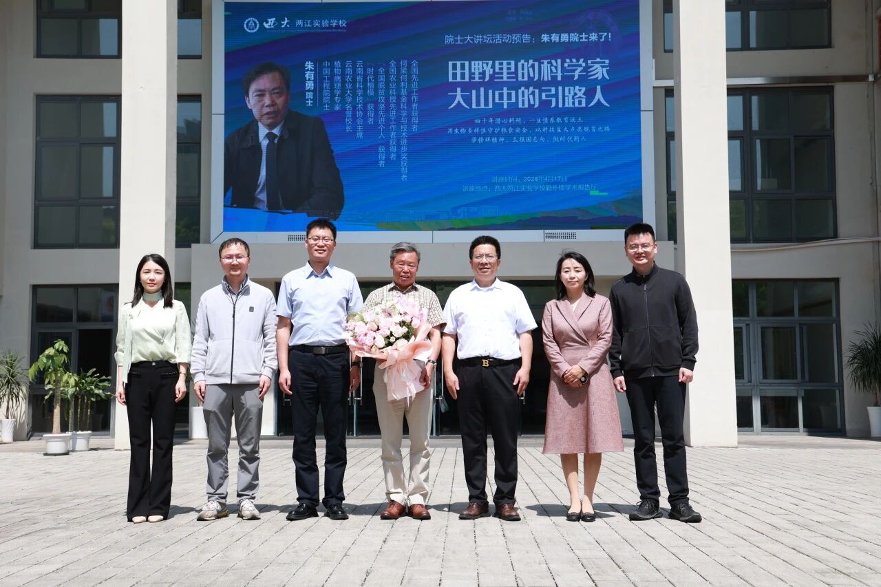 4月17日上午,西南大学附中蔡家校区迎来一场重磅科普盛宴 —— 中国工程院院士朱有勇亲临校园,以《把论文写在大地上:一个“农民院士”的科研经历》为主题,与附中学子深入交流,生动诠释科研精神、家国担当与成长力量。西南大学附属中学副校长游伟、西南大学植物保护学院副院长杨宇衡等领导和嘉宾出席本次课程。