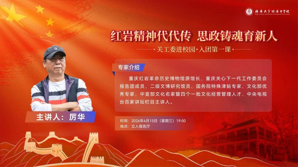 为深入学习贯彻习近平总书记关于青年工作的重要思想,落实团中央、团市委关于加强新时代团员队伍建设、深化团员思想政治引领的工作要求,积极响应重庆市关心下一代工作委员会进校园工作部署,4月15日,西南大学附属中学校2026年入团第一课在立人报告厅隆重举行。本次活动特邀重庆红岩革命历史博物馆原馆长、中央电视台百家讲坛栏目主讲人厉华带来专题团课,全体入团积极分子和初一年级少先队员代表参加学习。